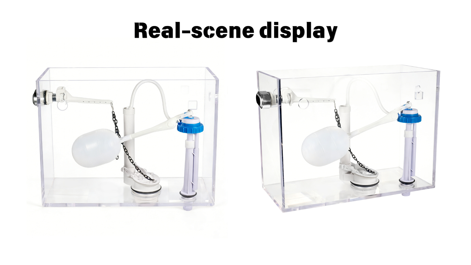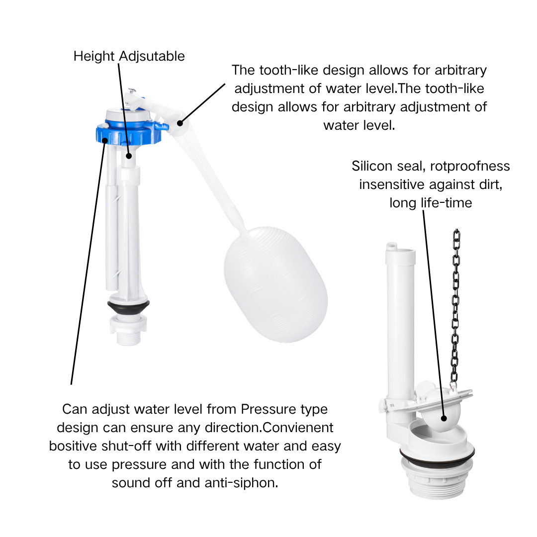 Fill valve height is adjustable, allowing flexible installation across different tank sizes.