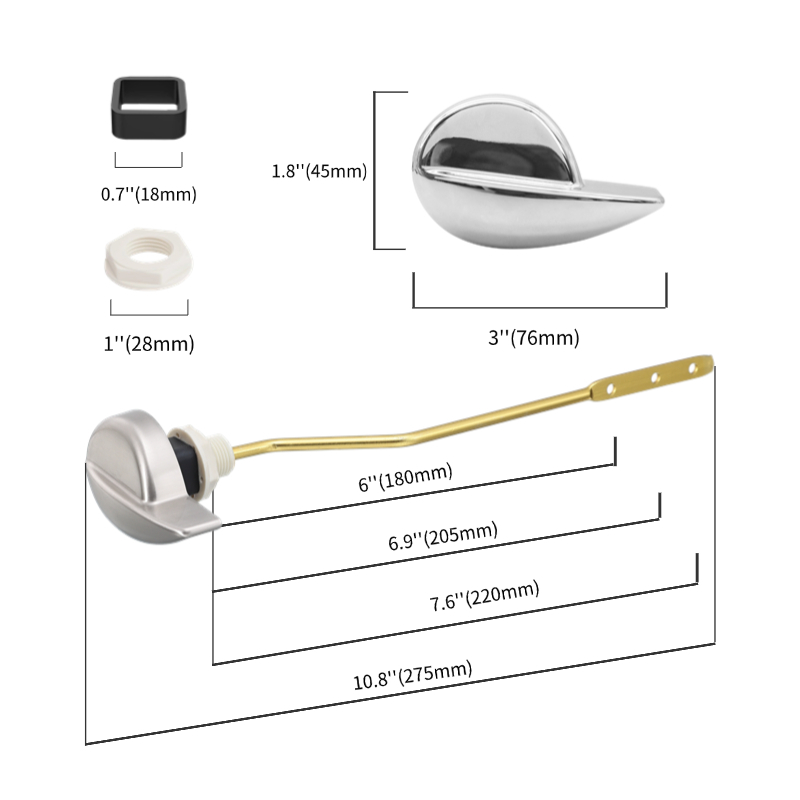 La maniglia di questo prodotto è realizzata in lega di zinco ed è disponibile nei seguenti colori: cromato, nero opaco, bianco, anticato, nichel spazzolato e dorato. La leva è in alluminio o ottone. Questi colori sono tra i più popolari sul mercato. Inoltre, lo stile della maniglia e della leva può essere liberamente combinato per soddisfare le diverse preferenze dei clienti. Alcune valvole di scarico WC, una volta installate, possono limitare lo spazio di movimento della maniglia di scarico. In questi casi, l'asta di scarico deve essere angolata per evitare l'area ostruita. Rispetto al T2408, il T2408-A utilizza un'asta piegata, rendendolo più adatto a queste situazioni.